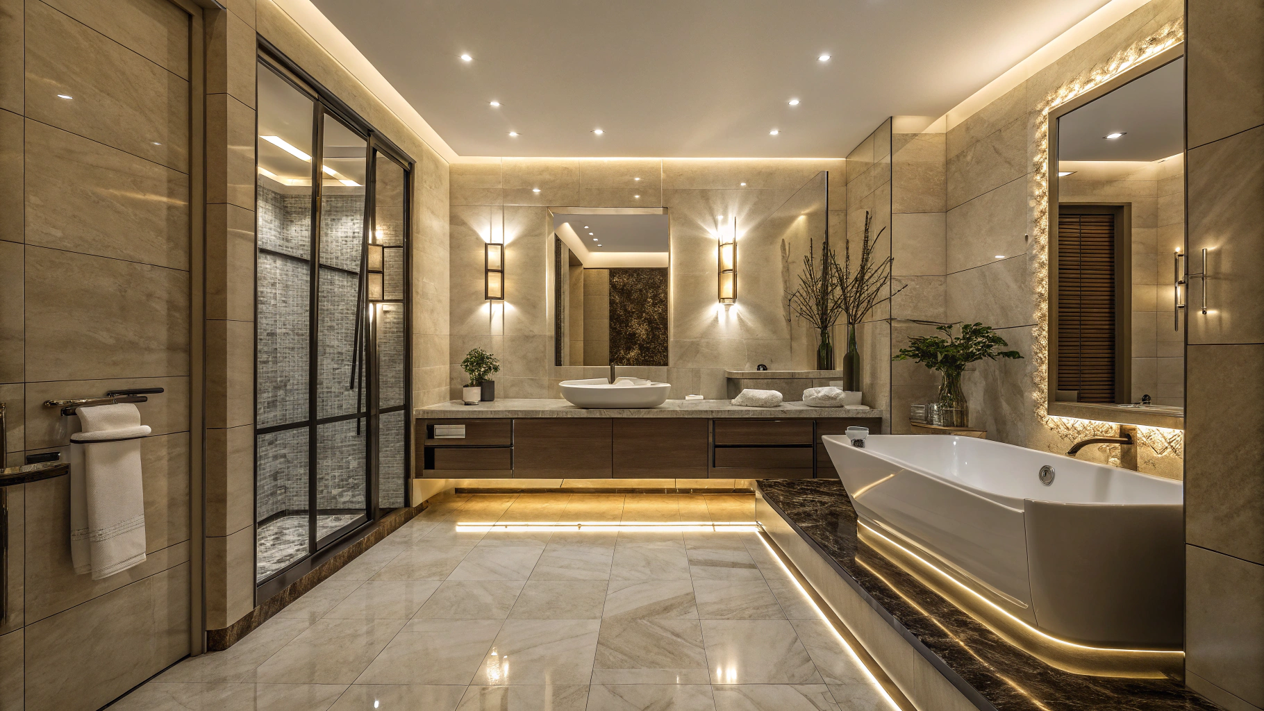 A full bathroom refurbishment featuring floor-to-ceiling large format porcelain and integrated LED lighting.