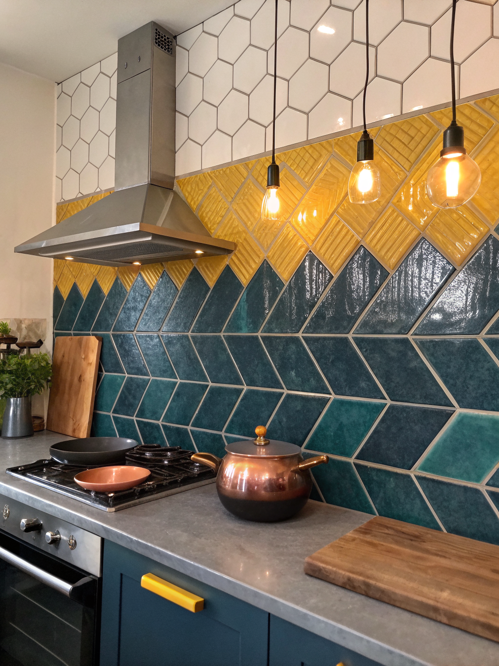 Intricate mosaic splashback and high-durability floor tiling for a premium residential kitchen renovation.